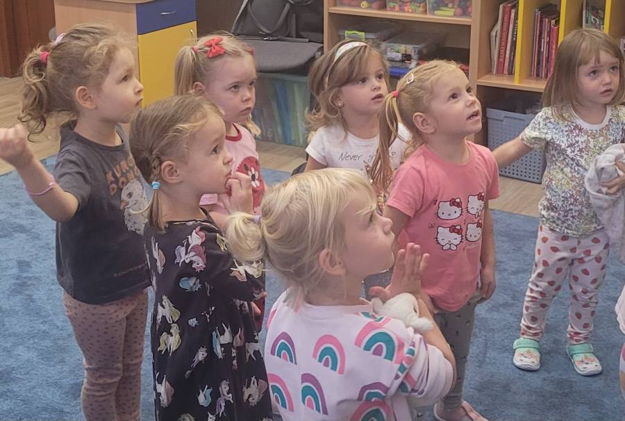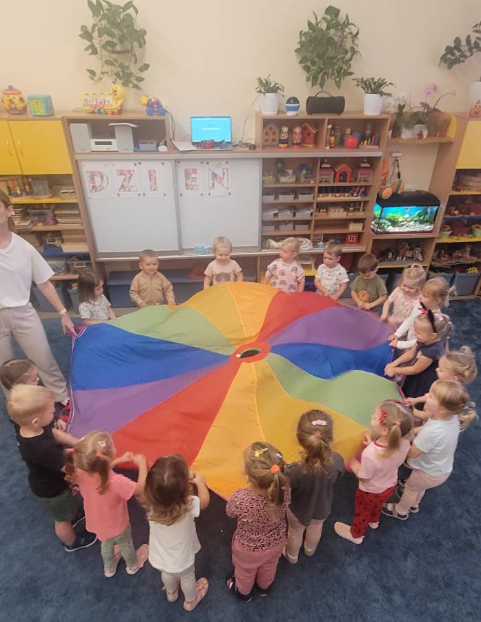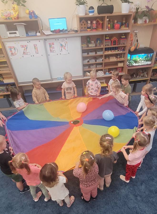 W dniu dzisiejszym grupa Kotków obchodziła Dzień Przedszkolaka. Dzieci tańczyły przy poznanych piosenkach, uczestniczyły w zabawach z chustą animacyjną Klanza, a także grały balonami.