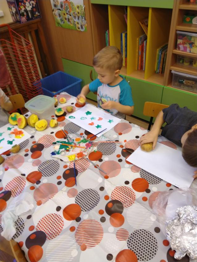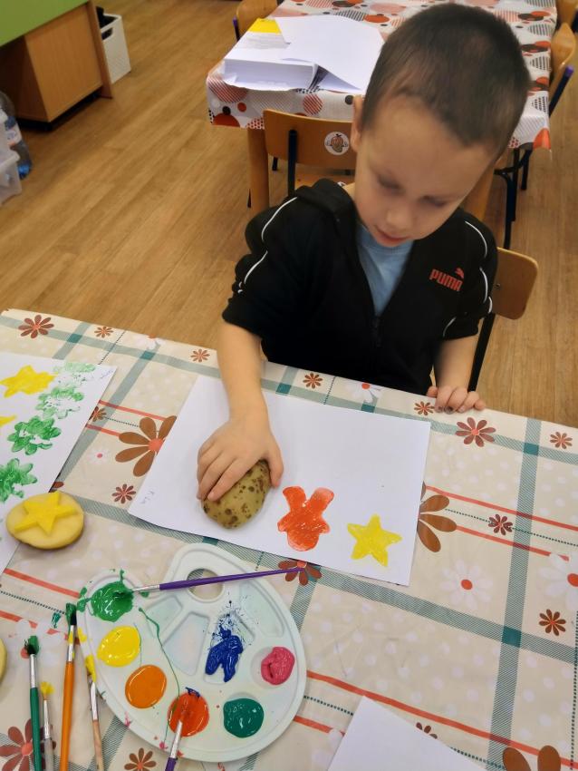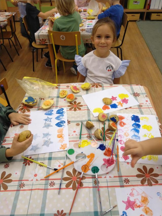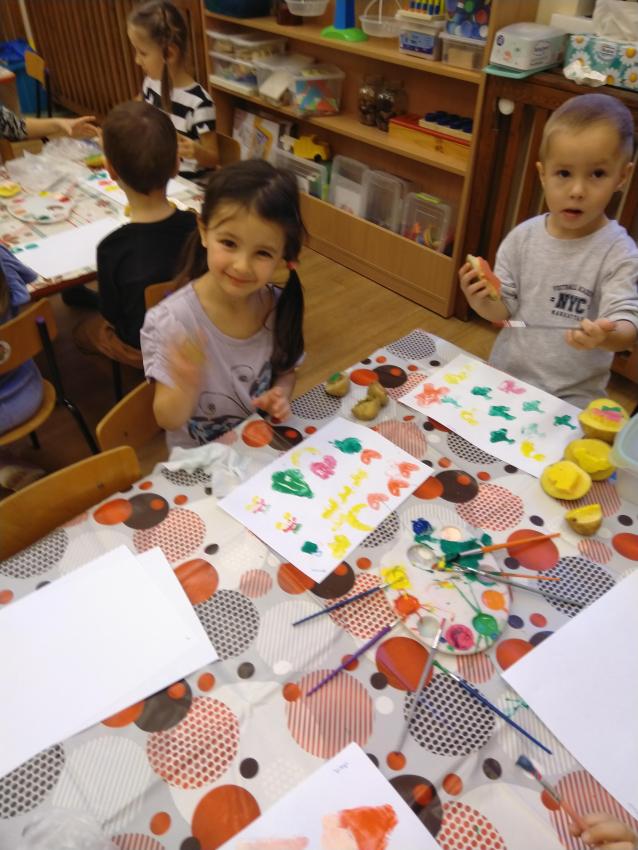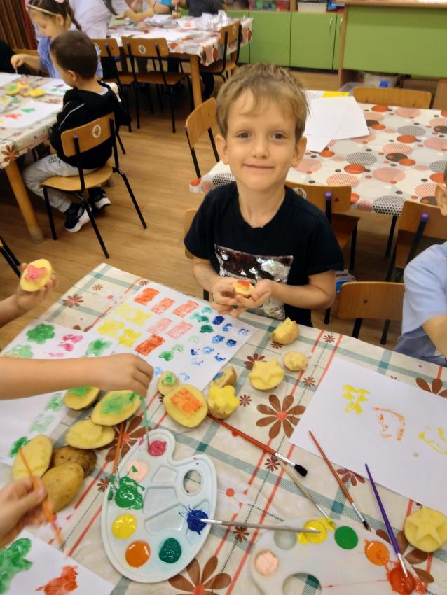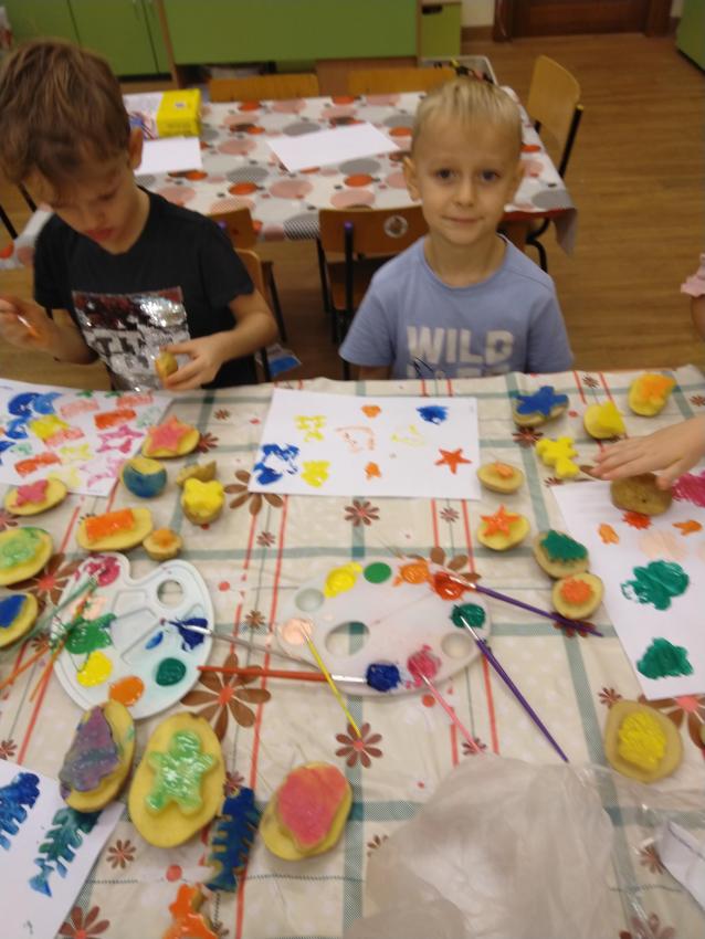 Dzisiaj dzieci z gr. IV stemplowały pieczątkami wyciętymi z ziemniaków. Było to nowe i ciekawe doświadczenie dające dzieciom wiele radości. Pieczątki były pięknie przygotowane i ciekawe.