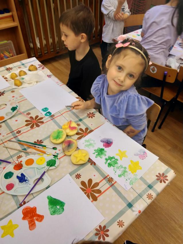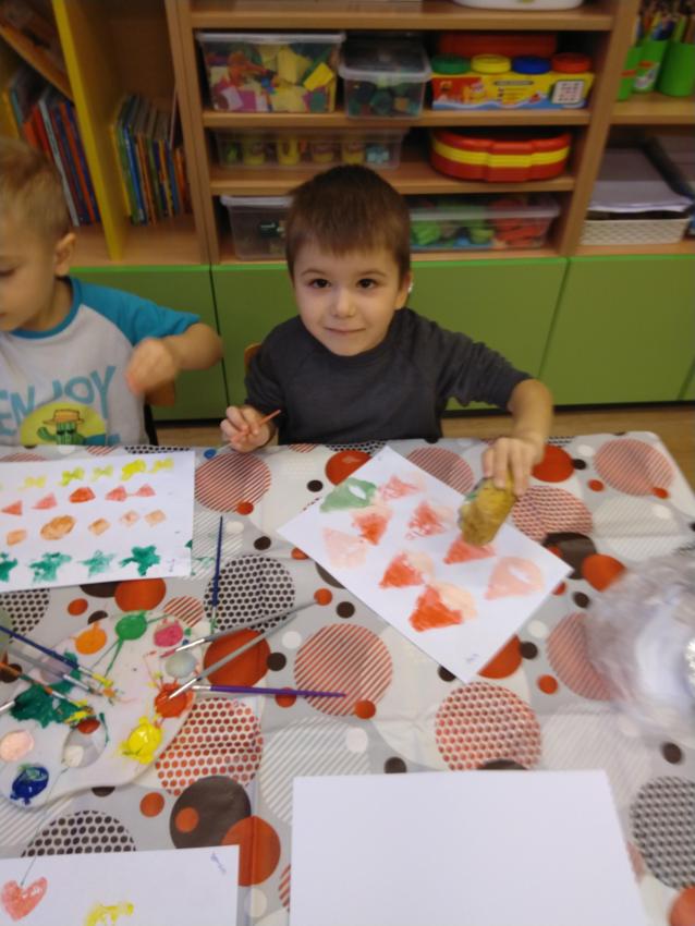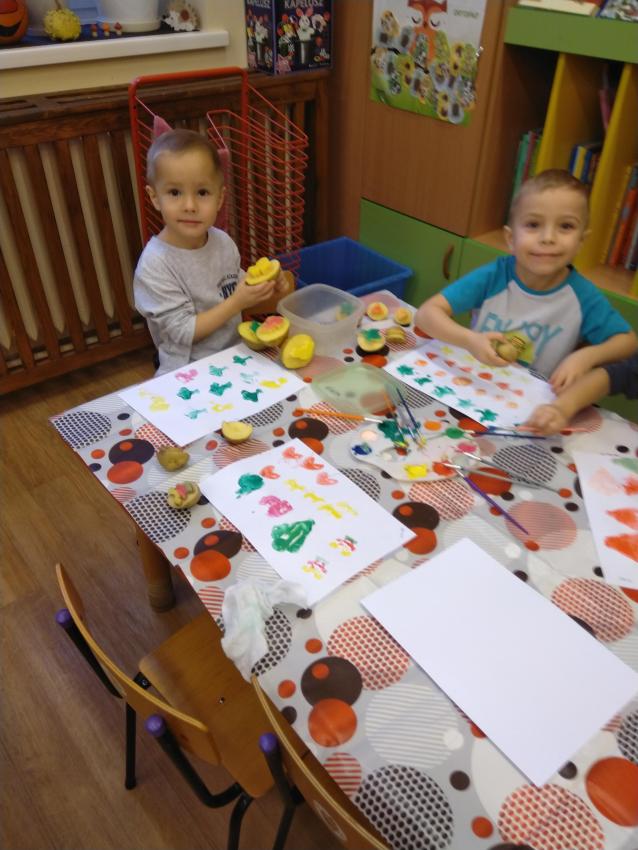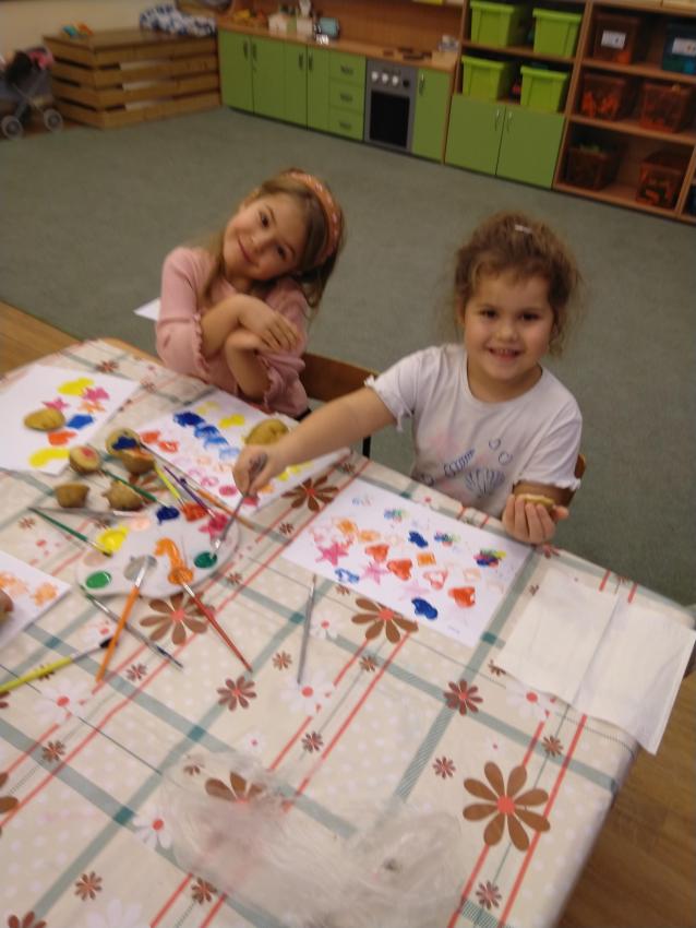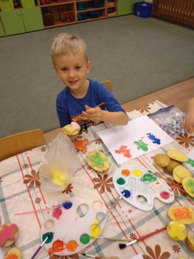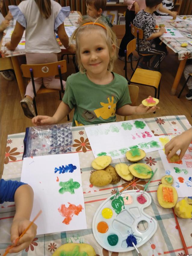 Dzisiaj dzieci z gr. IV stemplowały pieczątkami wyciętymi z ziemniaków. Było to nowe i ciekawe doświadczenie dające dzieciom wiele radości. Pieczątki były pięknie przygotowane i ciekawe.
