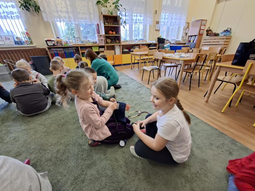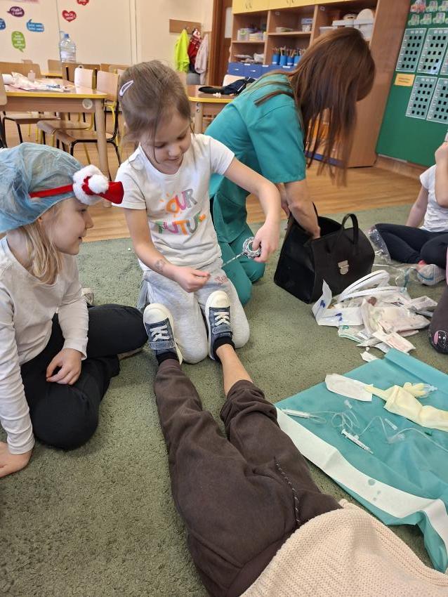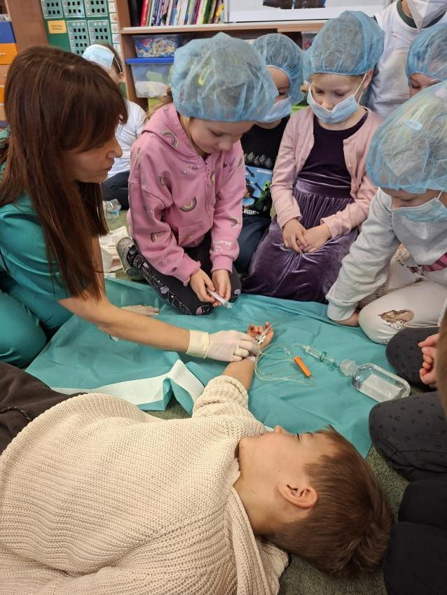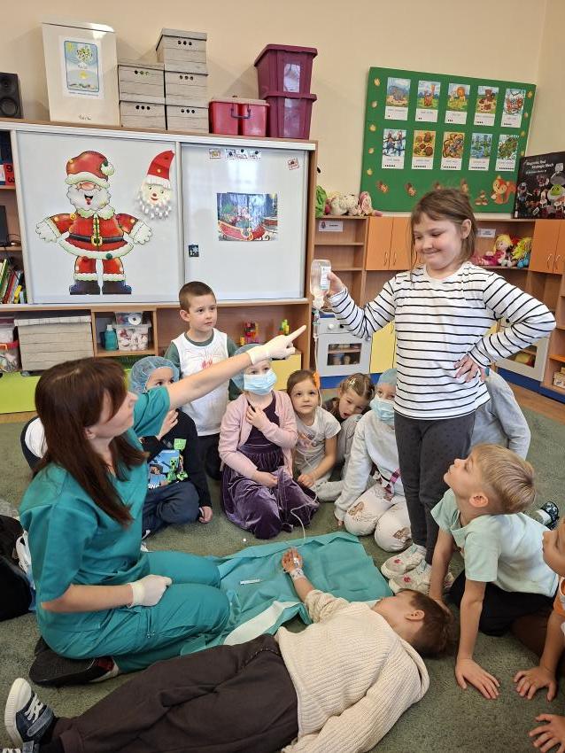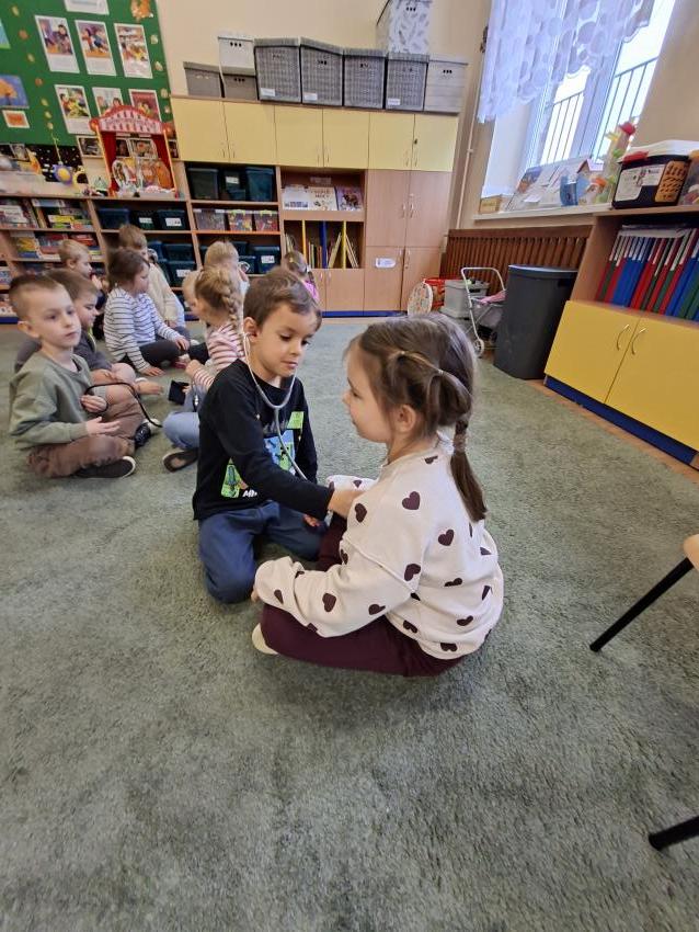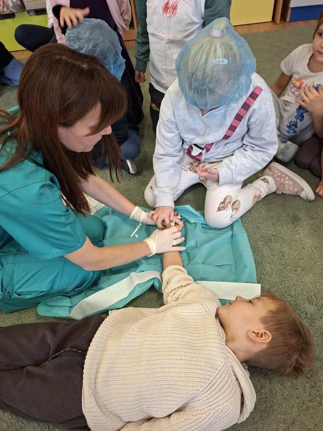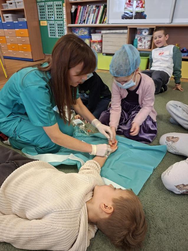 Dzisiaj gościła u nas Mama Stasia, lekarz neonatolog, która opowiedziała o swojej pracy. Przedszkolaki dowiedziały się o najważniejszych narządach organizmu i ich roli w życiu człowieka. Po udzielonej instrukcji przez Lekarza dzieci brały czynny udział w zabawach z użyciem prawdziwych przyrządów medycznych. Ogromne zainteresowanie wzbudził pokaz podania leków przez kroplówkę. Przedszkolaki przekonały się, że wizyta u lekarza jest potrzebna, ważna, może być nawet?.przyjemna i nie należy się bać.