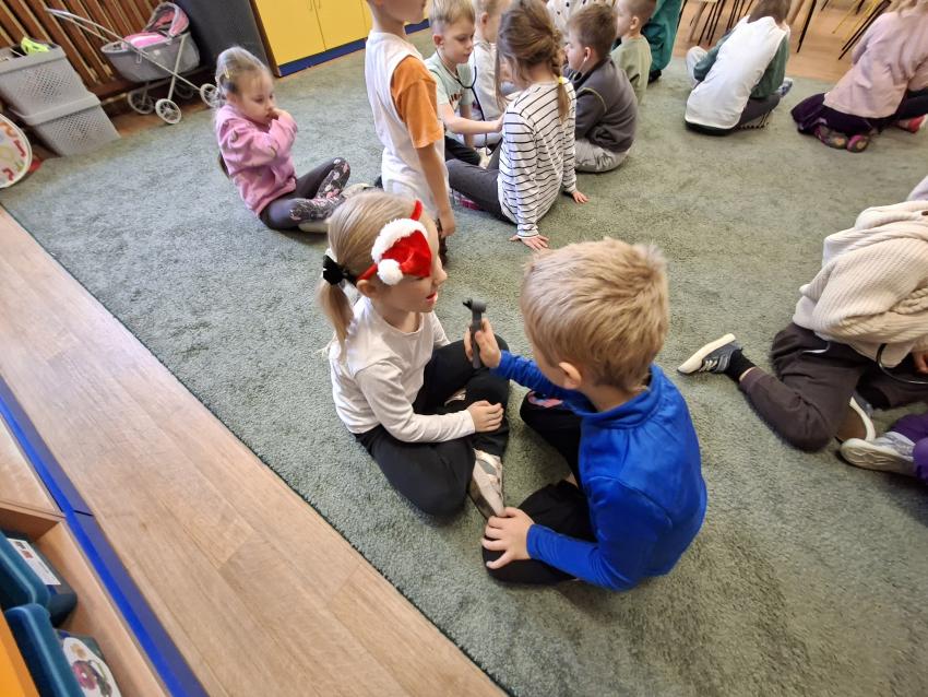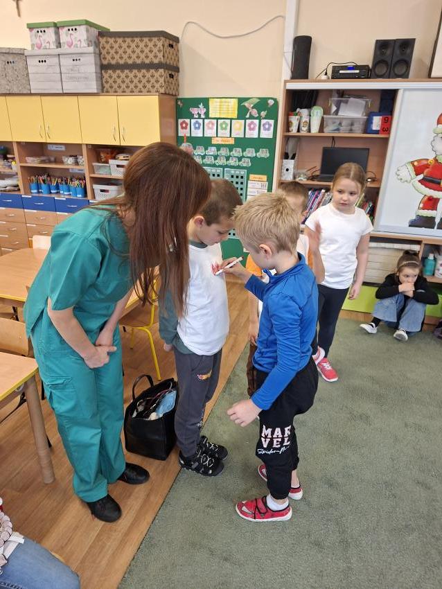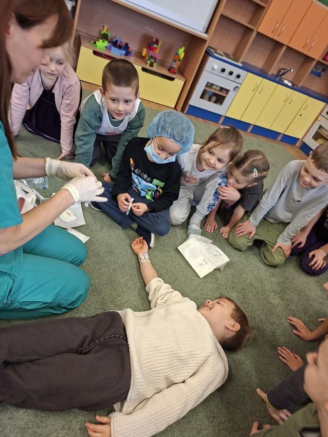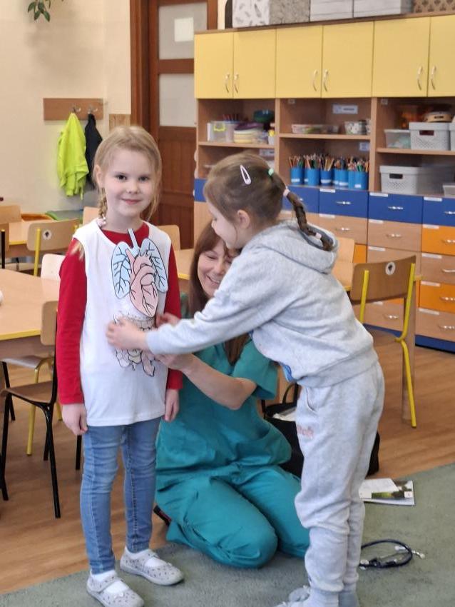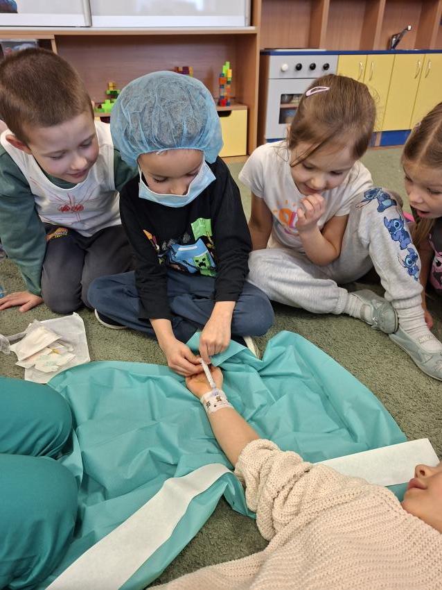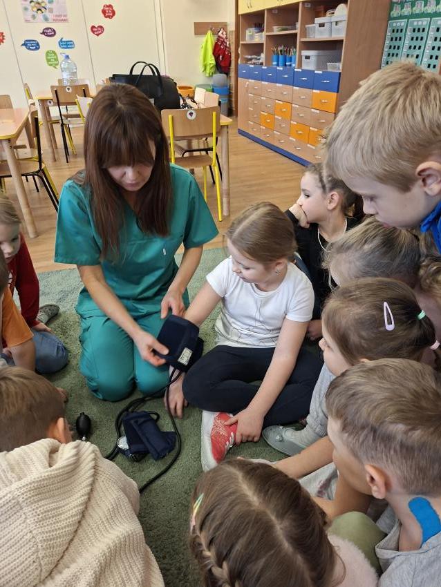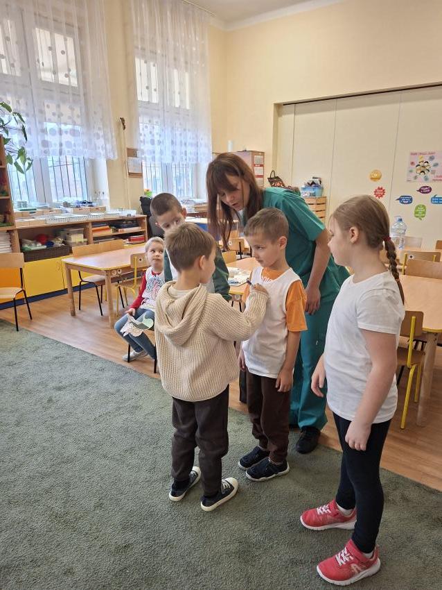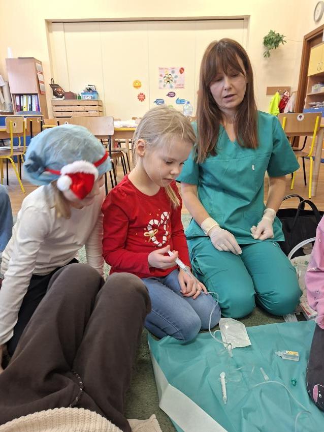 Dzisiaj gościła u nas Mama Stasia, lekarz neonatolog, która opowiedziała o swojej pracy. Przedszkolaki dowiedziały się o najważniejszych narządach organizmu i ich roli w życiu człowieka. Po udzielonej instrukcji przez Lekarza dzieci brały czynny udział w zabawach z użyciem prawdziwych przyrządów medycznych. Ogromne zainteresowanie wzbudził pokaz podania leków przez kroplówkę. Przedszkolaki przekonały się, że wizyta u lekarza jest potrzebna, ważna, może być nawet?.przyjemna i nie należy się bać.