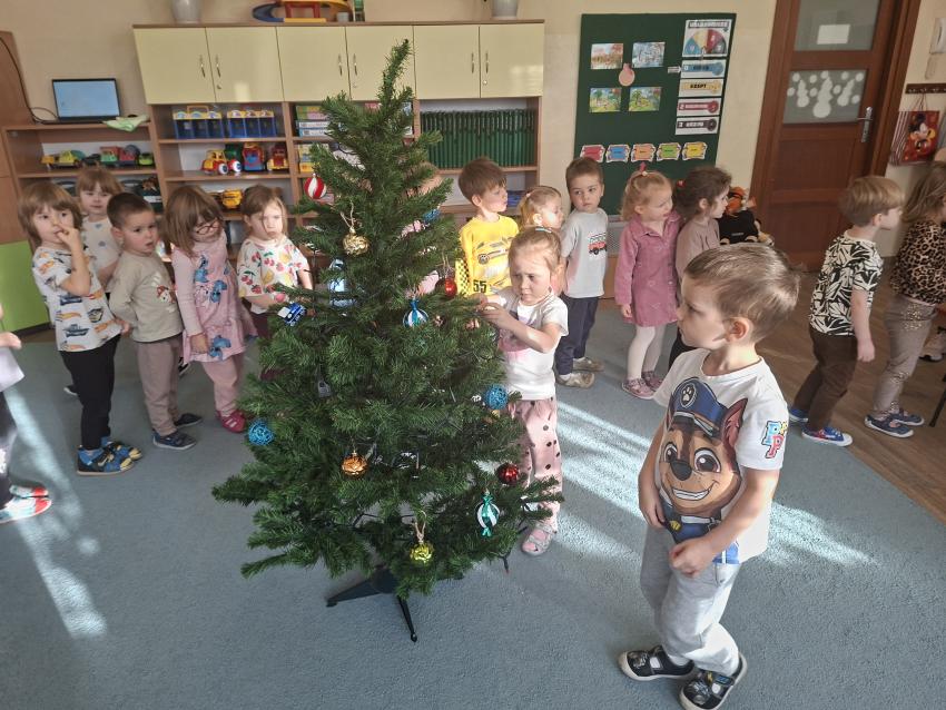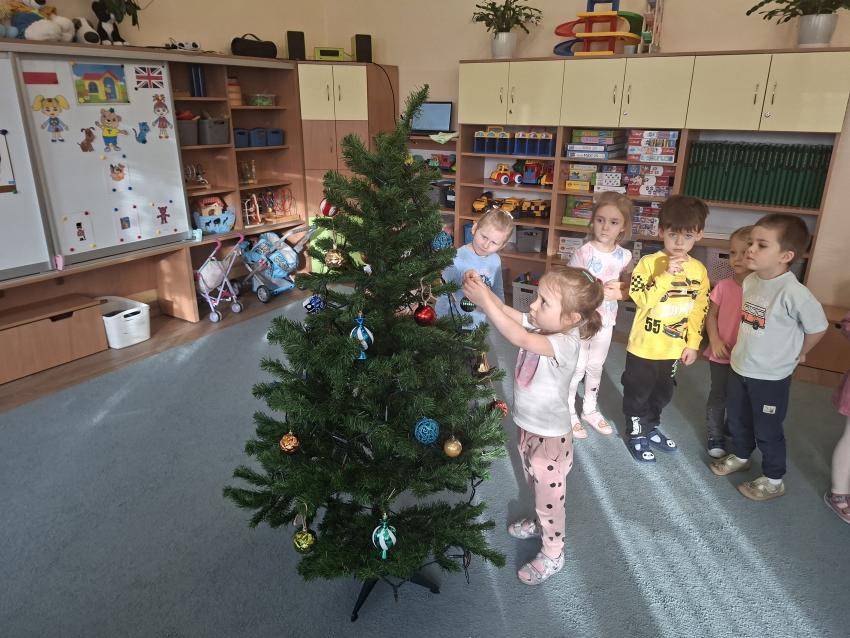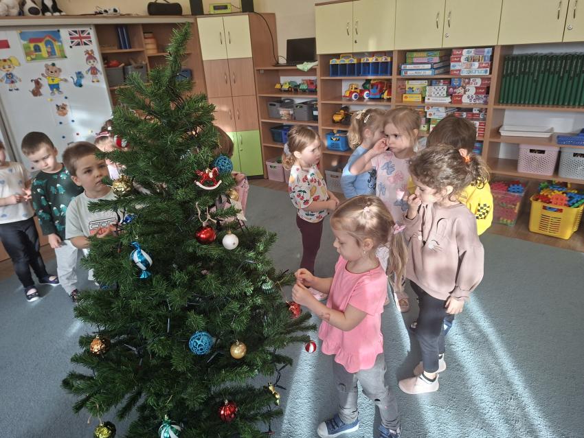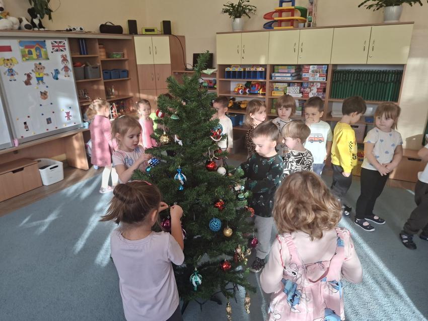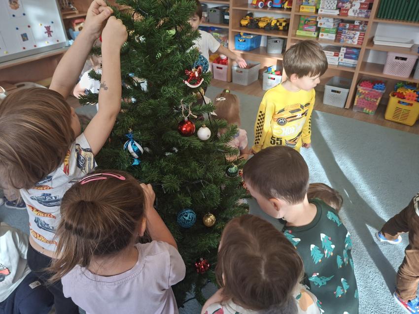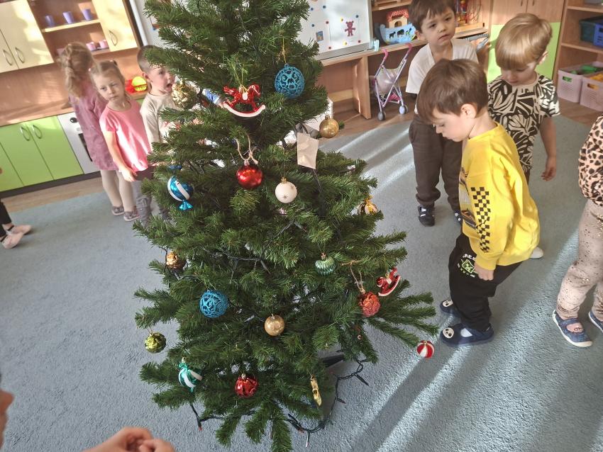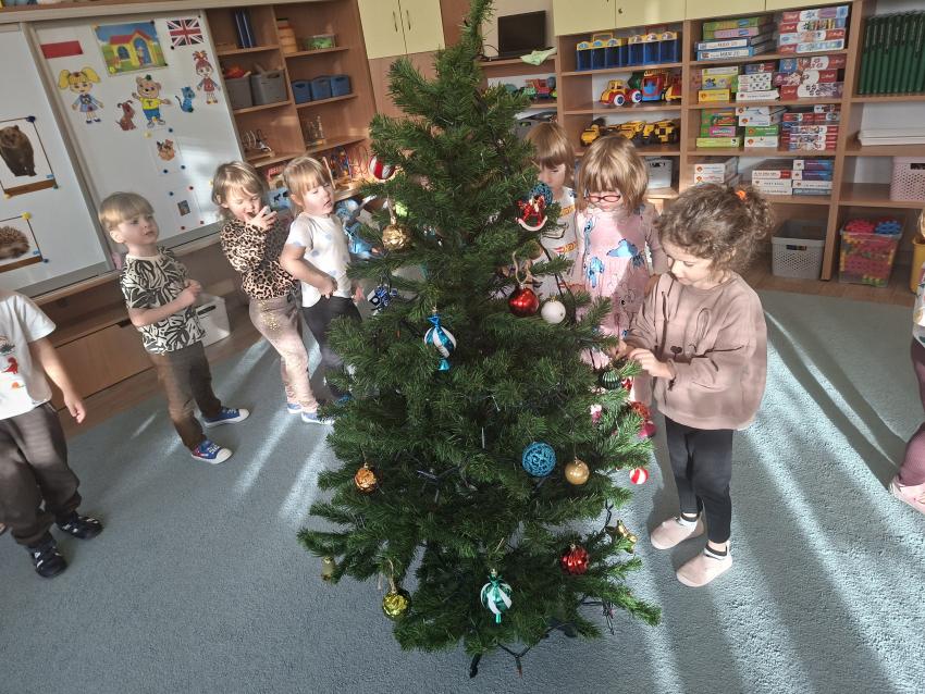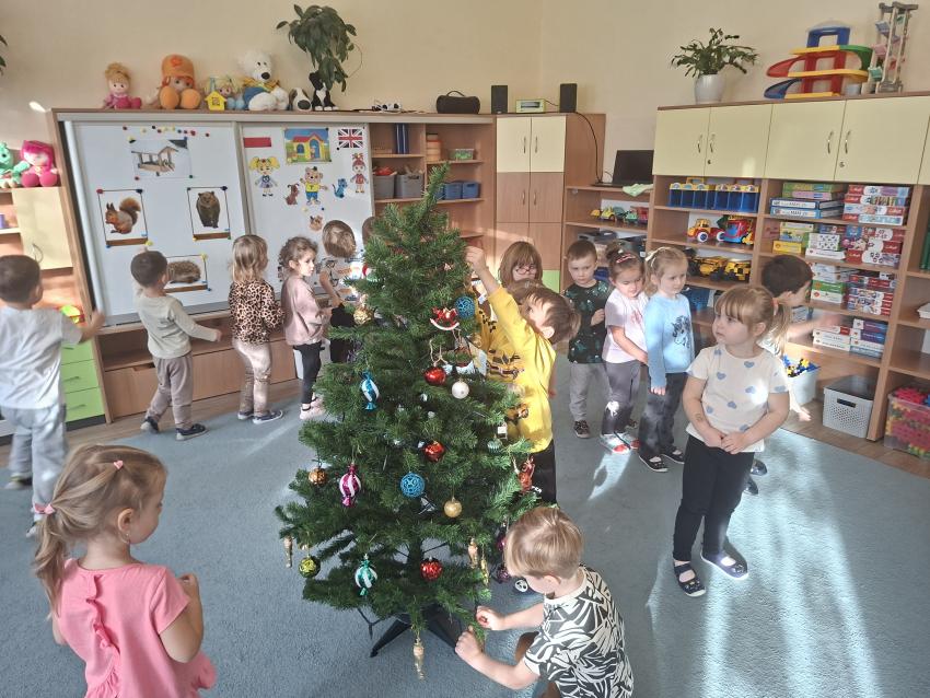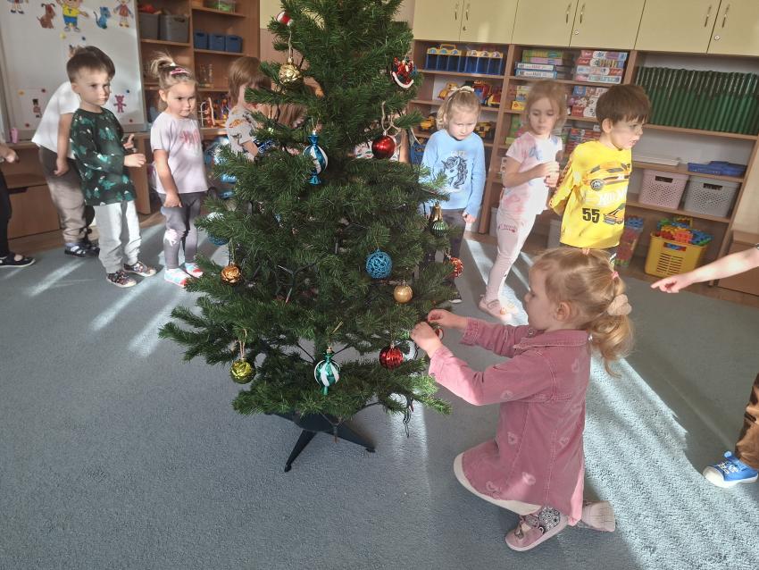 W tym dniu dzieci z grupy Pszczółek, pięknie ozdobiły naszą choinkę, która już swoim blaskiem zachwyca każdego!