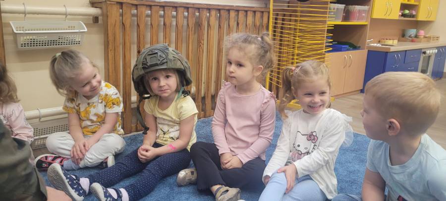 W dniu dzisiejszym grupę Kotki odwiedził tata Filipa, który na codzień pracuje w wojsku. Dzieci z uwagą słuchały Pana Sylwestra dowiadując się jak ważną rolę spełnia. Miały także okazję zobaczyc atrybuty pracy wojskowego takie jak kamizelka czy kask. Dziękujemy serdecznie za zorganizowanie ciekawych zajęć.