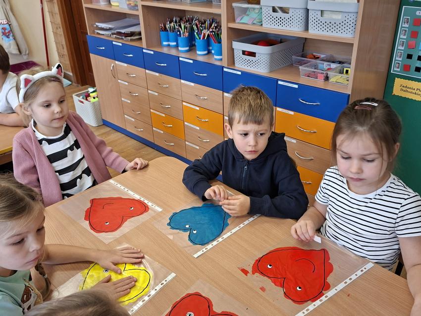 Dzisiaj na zajęciach plastycznych dzieci wykonały pracę MOJA EMOCJA. Przekazały swoje uczucia za pomocą ekspresji twórczej. Zapoznały się z techniką rozprowadzania farby w koszulce foliowej, którą wykonywały z wielką starannością i dokładnością, aby wypełnić serduszka. Następnie pisakiem wyraziły swoją emocję. W przekazie dominowała radość, ale również znalazły się takie emocje jak miłość, smutek i złość, o których przedszkolaki chętnie nam opowiedziały.
