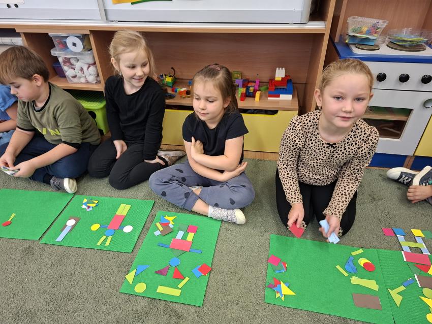 Przedszkolaki na zajęciach matematycznych rozpoznawały kształty w otoczeniu. W nawiązaniu do Dnia Kropki dzieci w parach układały obrazki pocięte na części. Pomagając sobie wzajemnie wszystkim udało się ułożyć kształt koła. Następnie każdy zespół przeliczał ilość kropek w swoim kole.