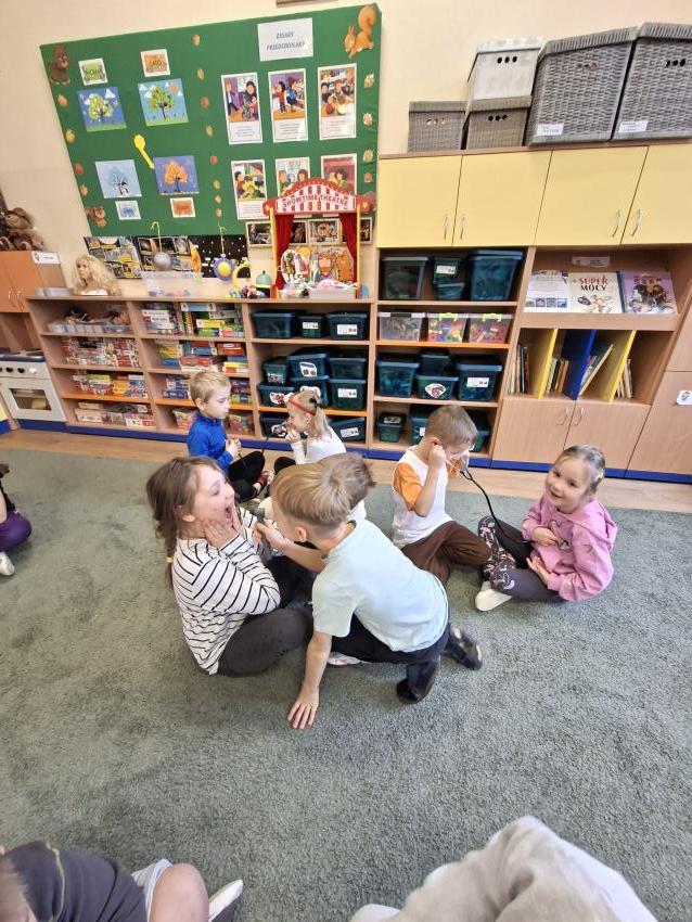 W dniu dzisiejszym naszą grupę odwiedził tata Alicji - Pan Michał, który pracuje jako chirurg. Przedszkolaki wspólnie układały puzzle będące narządami ciała człowieka. Wykazały się ogromną wiedzą na ten temat. Następnie każde dziecko losowało przedmiot o którym Pan Michał opowiadał do czego służą. Znalazły się tam między innymi wenflon, bandaż czy koc ratunkowy. Pluszowy piesek okazał się dzielnym pacjentem, dzięki któremu dzięki zobaczyły jak zakłada się kroplówkę oraz w jakich przypadkach się ją stosuje. Chętni mogli zmierzyć ciśnienie i, owijać się bandażem a także przybić prawdziwą pieczątkę lekarza na recepcie. Największą atrakcją był pokaz zszywania rany na bananie. Wymaga to wielkiej precyzji i skupienia. Każdy z przedszkolaków otrzymał naklejkę dzielnego pacjenta.
