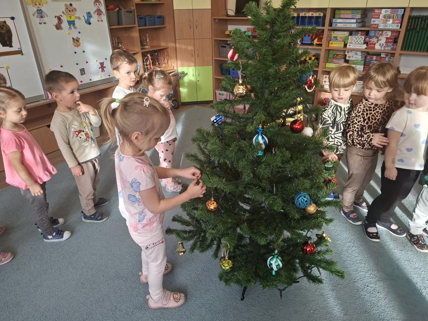W tym dniu dzieci z grupy Pszczółek, pięknie ozdobiły naszą choinkę, która już swoim blaskiem zachwyca każdego!