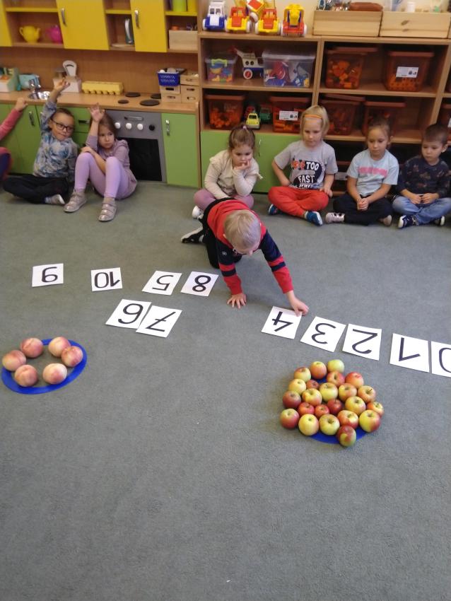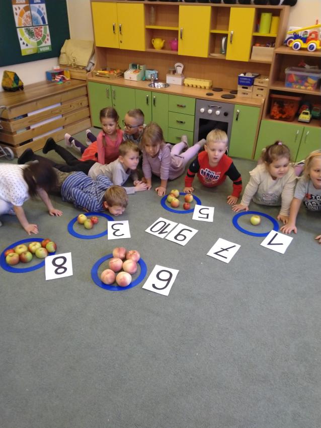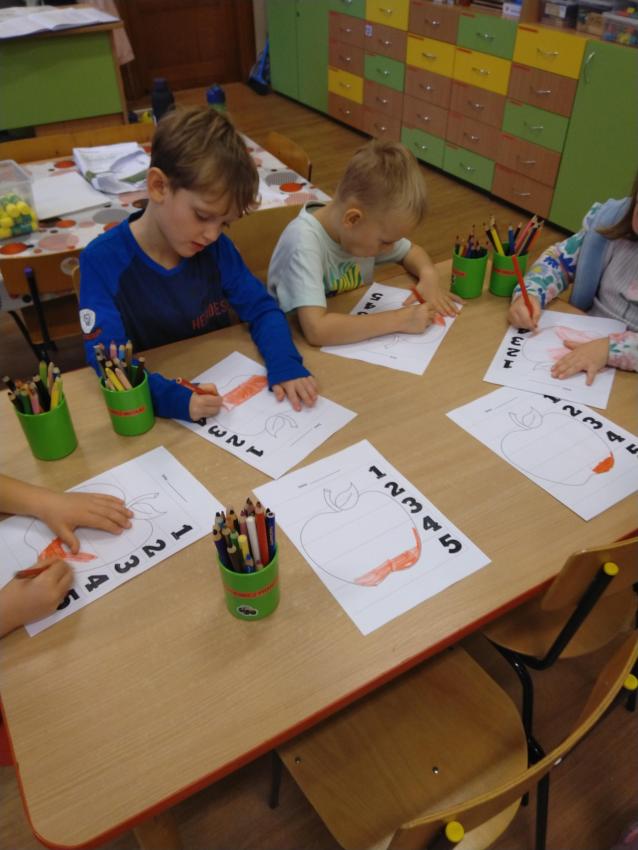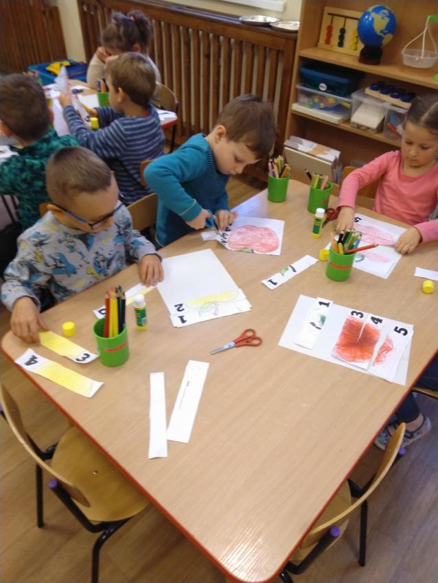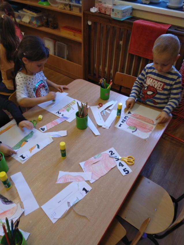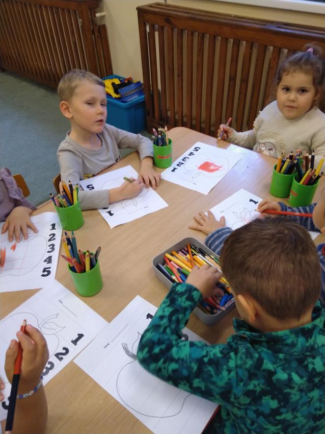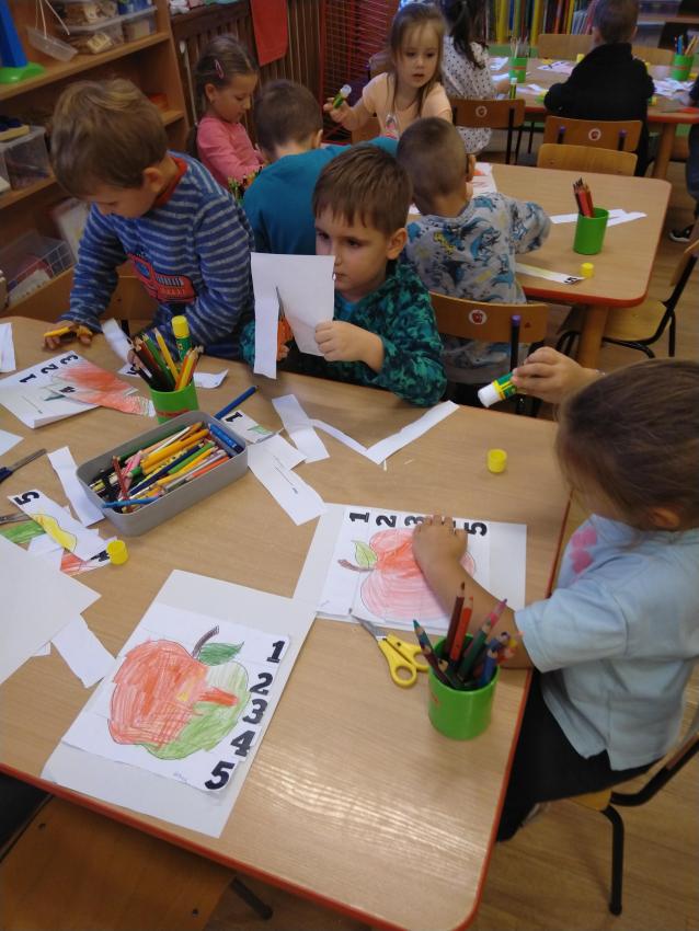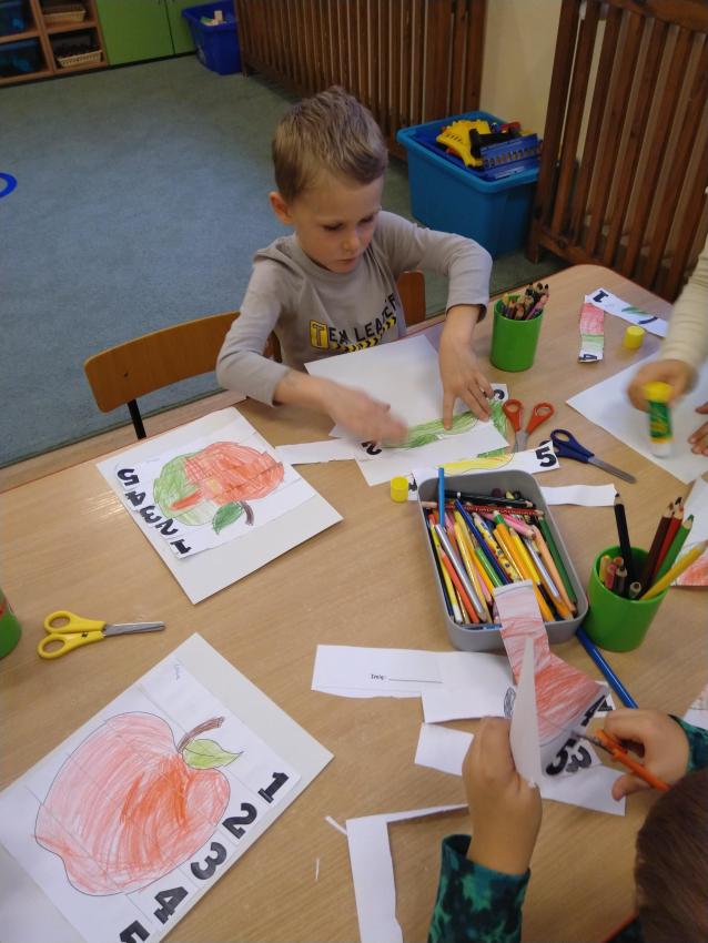 Pingwinki podczas zabaw poznawały zapis cyfrowy liczb, klasyfikowały zbiór owoców, przeliczały, porównywały ilość. Wykonały pracę: puzzle paskowe z sylwetą jabłka i cyframi w zakresie 1-5.