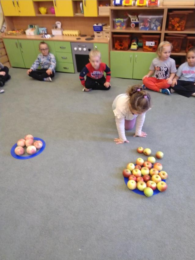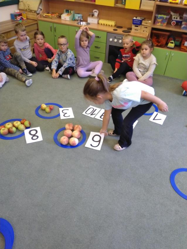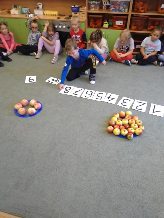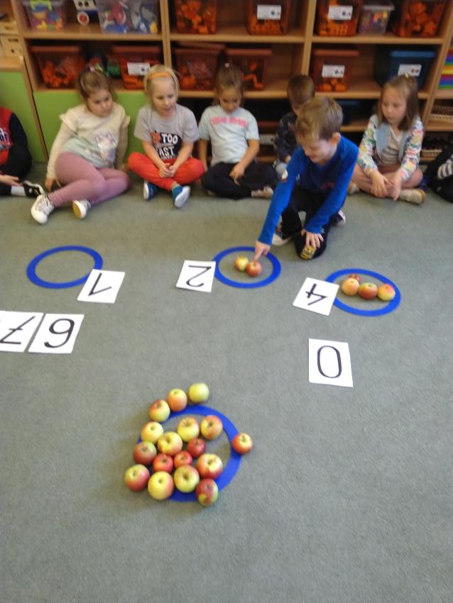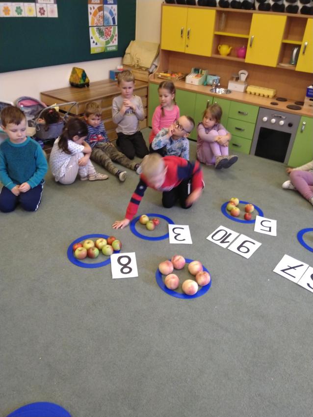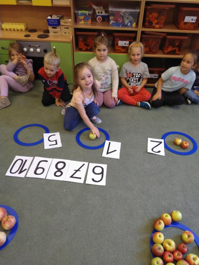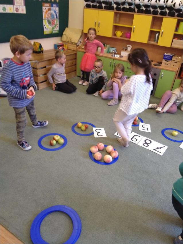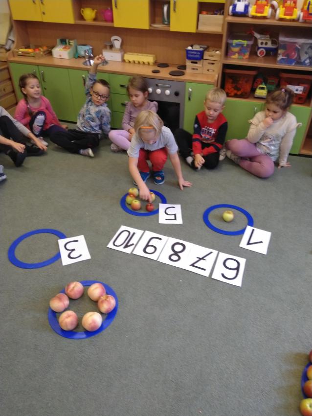 Pingwinki podczas zabaw poznawały zapis cyfrowy liczb, klasyfikowały zbiór owoców, przeliczały, porównywały ilość. Wykonały pracę: puzzle paskowe z sylwetą jabłka i cyframi w zakresie 1-5.