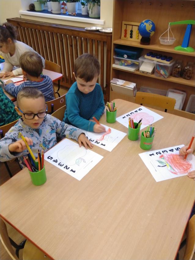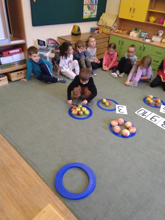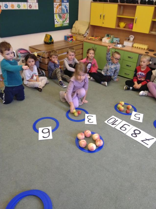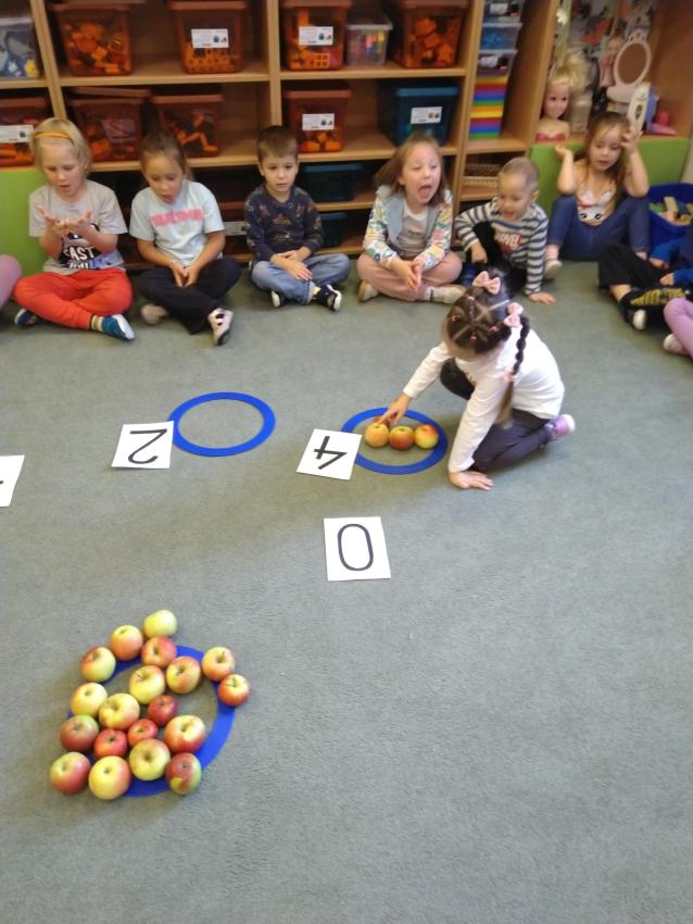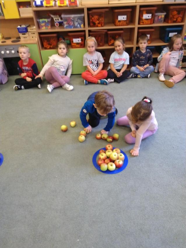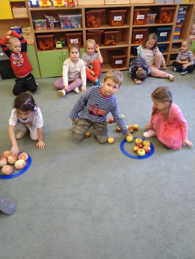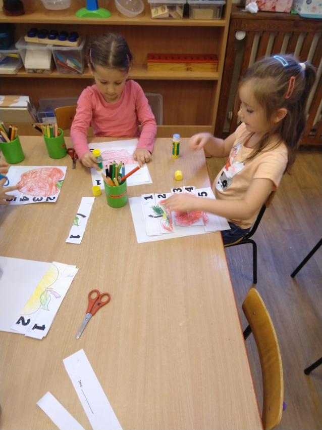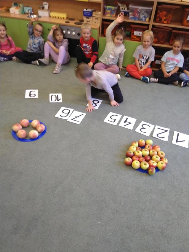 Pingwinki podczas zabaw poznawały zapis cyfrowy liczb, klasyfikowały zbiór owoców, przeliczały, porównywały ilość. Wykonały pracę: puzzle paskowe z sylwetą jabłka i cyframi w zakresie 1-5.