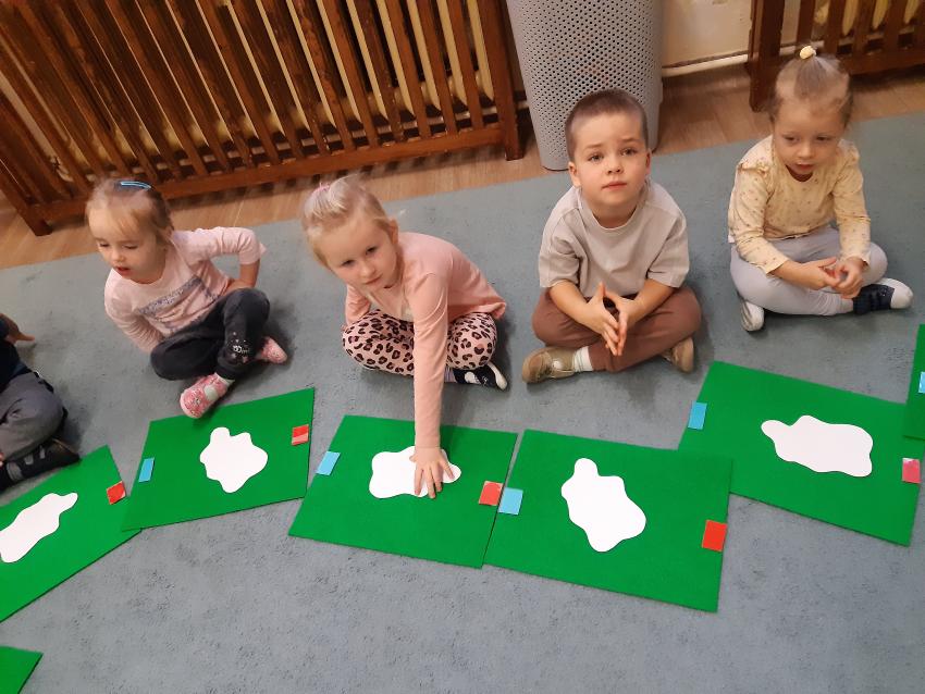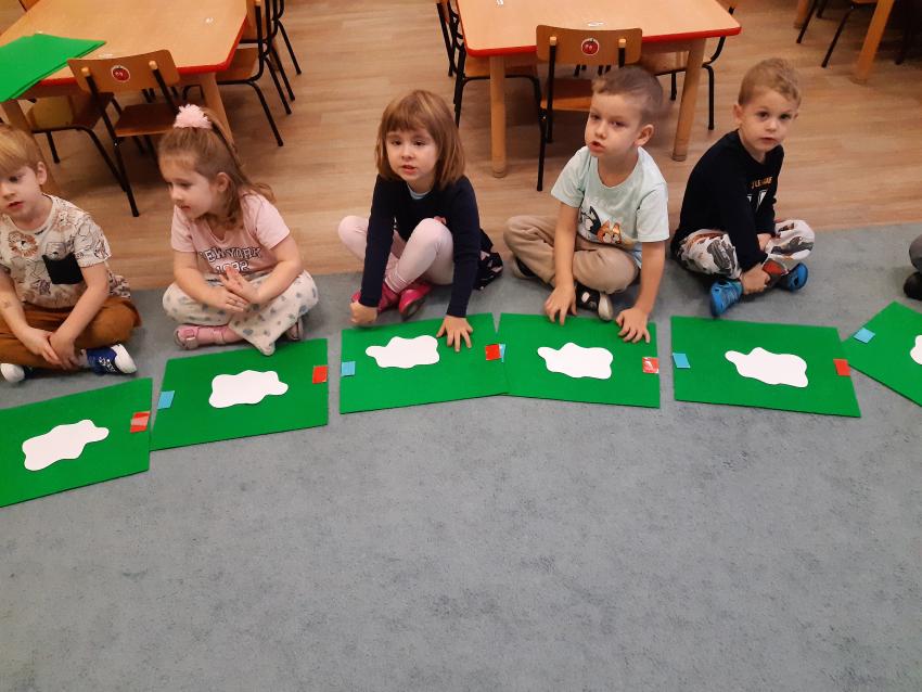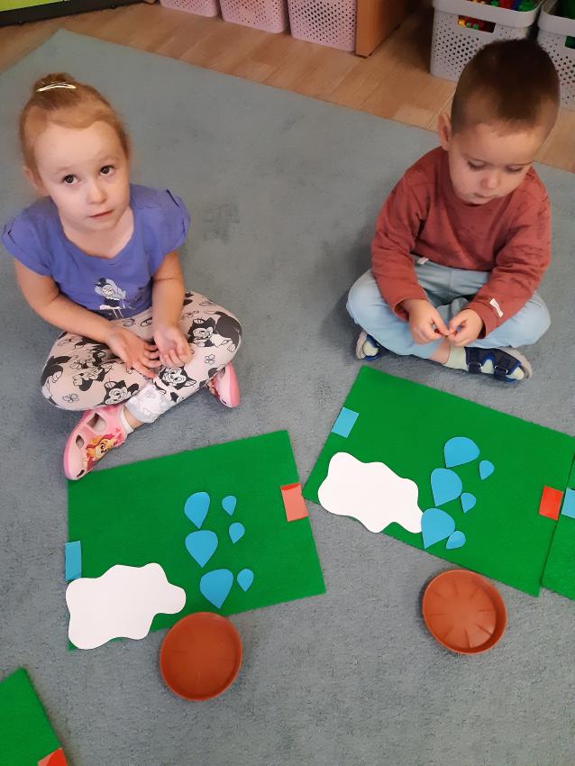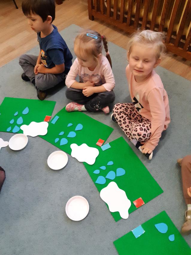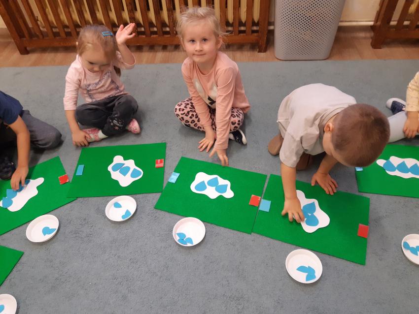 Podczas zajęć dzieci porównywały liczebność zbiorów ,klasyfikowały kropelki wg wielkości .Liczyły deszczowe krople .Doskonaliły percepcję słuchową podczas zabawy " Posłuchaj ile kropli spadło?"