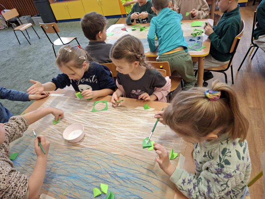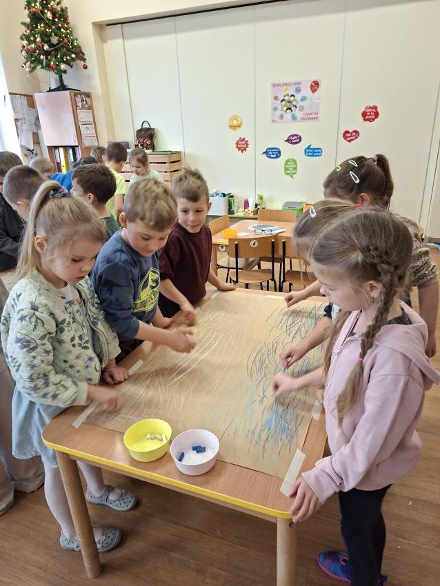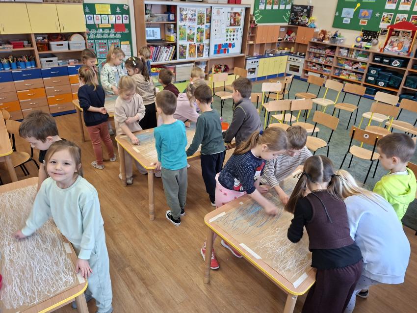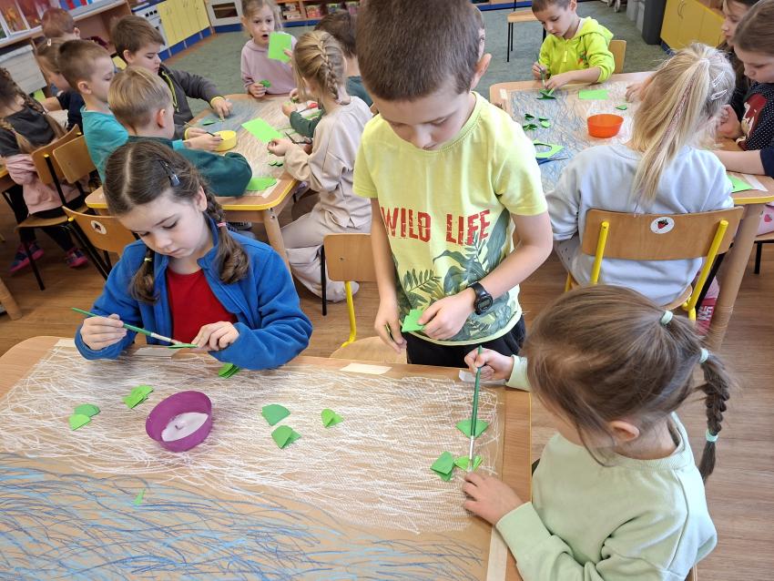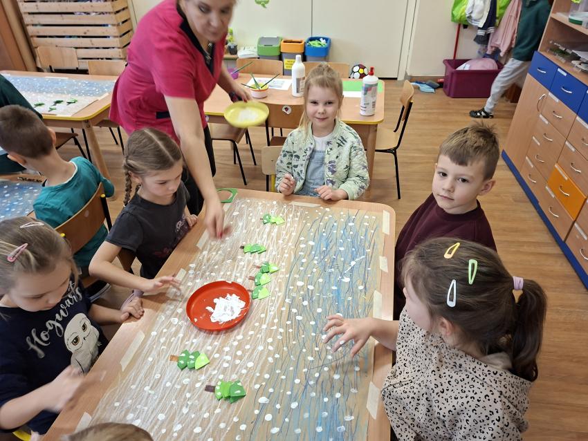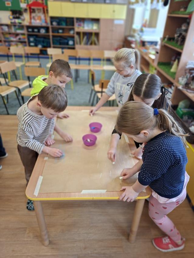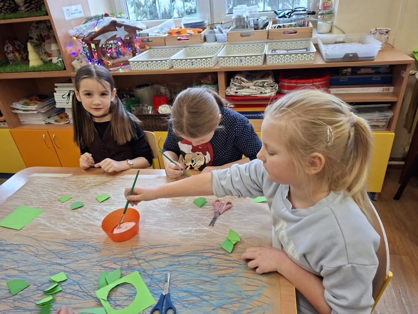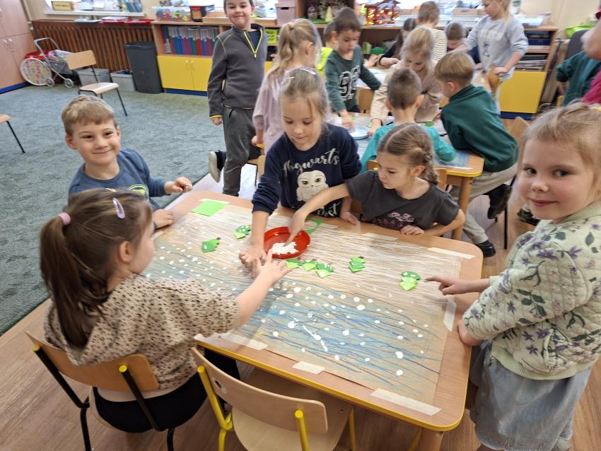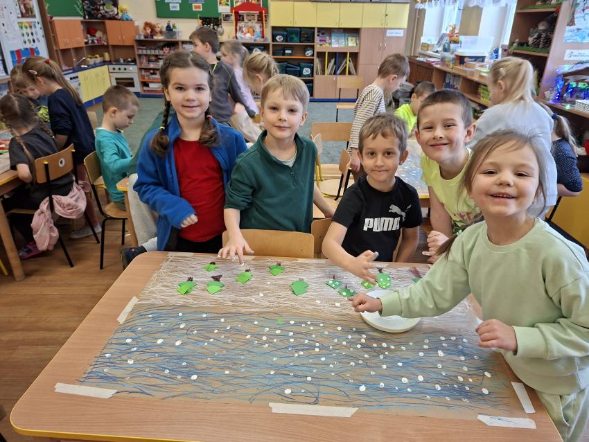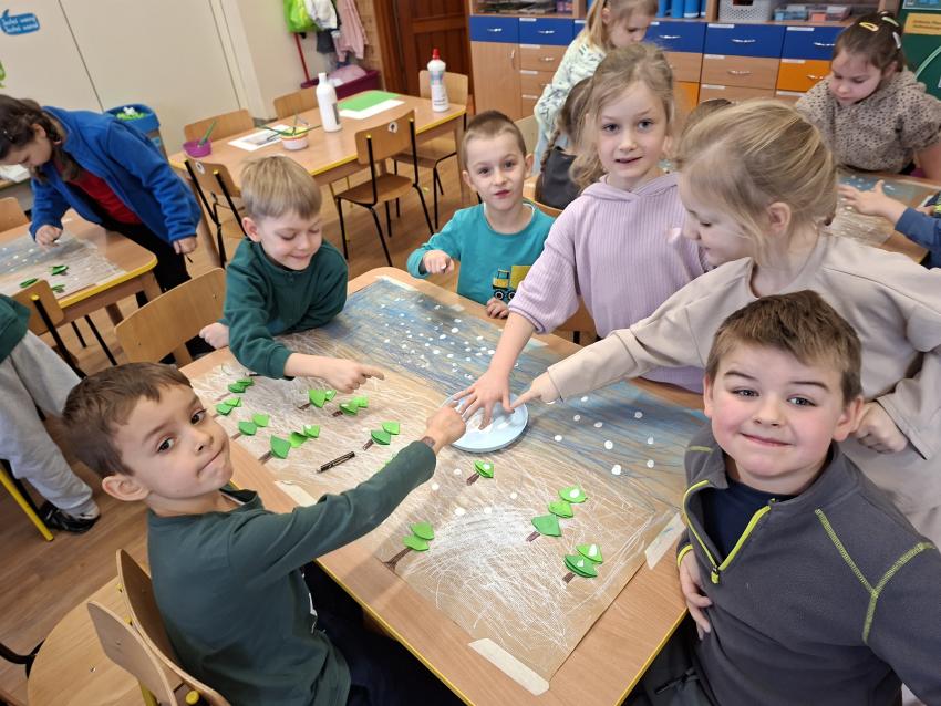 W dniu dzisiejszym na zajęciach plastycznych przedszkolaki wykonały pracę LAS ZIMĄ metodą Doroty Dziamskiej EDUKACJA PRZEZ RUCH, która wykorzystuje naturalny ruch dziecka do stymulacji zmysłów. Najpierw dzieci rytmicznie kreśliły kreski do utworu Annen Polka J. Straussa. Potem przyklejały drzewa wykorzystując technikę origami, a na koniec białą farbą odbijały palcem śnieg. Prace wykonały w małych grupach rozwijając umiejetność współpracy i szacunku dla siebie. Brawo dla dzieci, piękny efekt, owocna współpraca.