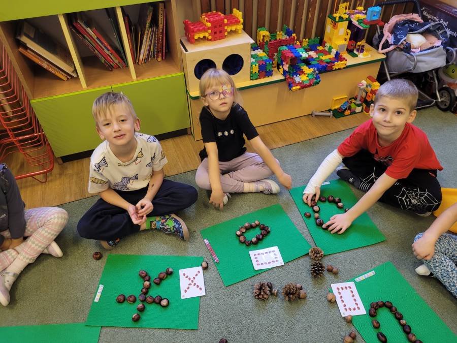Podczas jesiennego spaceru z rodziną Liski nazbierały dużo kasztanów i żołędzi, które przyniosły do przedszkola. Zdobią one nie tylko nasz jesienny kącik, ale także służą dzieciom do zabawy. Wykorzystujemy dary jesieni między innymi do zabaw matematycznych. Liski potrafią układać je w szeregu, kole, przeliczają, tworzą zbiory. Na koniec z kasztanów układały kasztanowe wzory, a chętne dzieci miały frajdę podczas wymyślania kasztanowych kształtów.