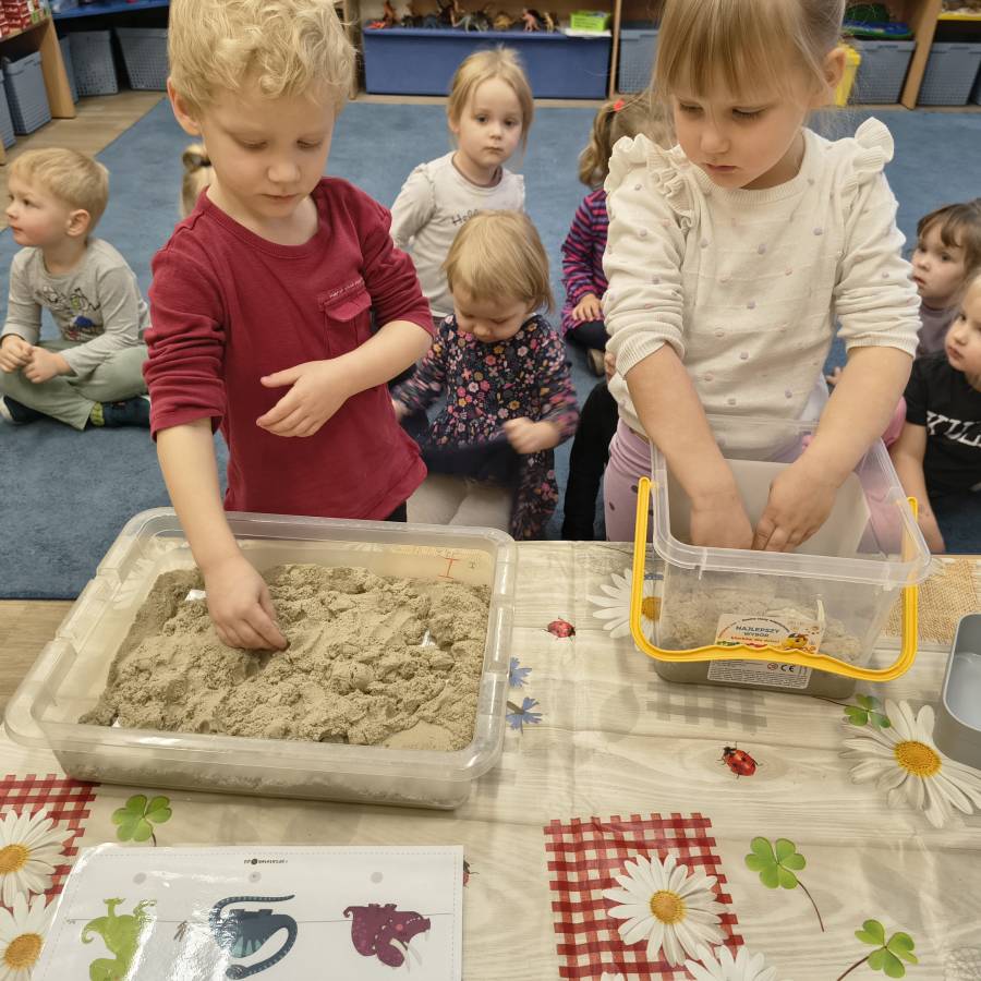 Dzieci poszukiwały w piasku kinetycznym kości dinozaurów, odciski łap, skamieniałe muszle, rośliny.