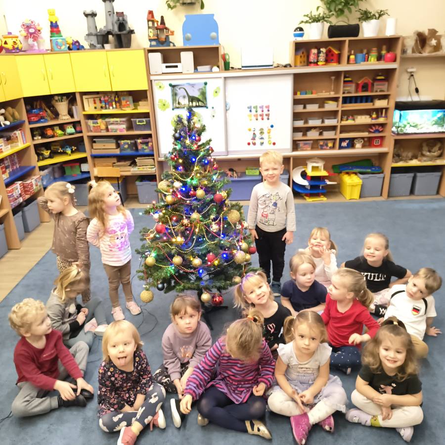 W oczekiwaniu na święta dzieci z grupy Żabek wspólnie ubrały swoją grupową choinkę. Każdy chciał zawiesić swoje ozdoby, aby choinka wyglądała pięknie. Gdy choinka była już ubrana, dzieci zaśpiewały wokół niej piosenki świąteczne.