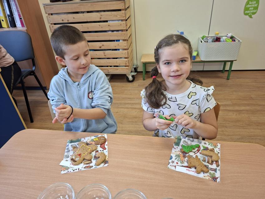 W dniu dzisiejszym w grupie Mróweczki odbyły się warsztaty ozdabiania pierników świątecznych przygotowane przez Mamę Tymusia. Dzieci najpierw wymieniały potrzebne produkty do wypieku pierników, potem wysłuchały opowieści o Pani Mikołajowej. Następnie z wielką radością przystąpiły do dekorowania ciasteczek według inwencji własnej. Malowały wzory z lukru, posypywały kolorowymi posypkami i perełkami w różnych kształtach. Przedszkolaki stworzyły efektowne i niespotykane wzory, a towarzyszyły dzieciom piękne, pozytywne i już świąteczne nastroje.