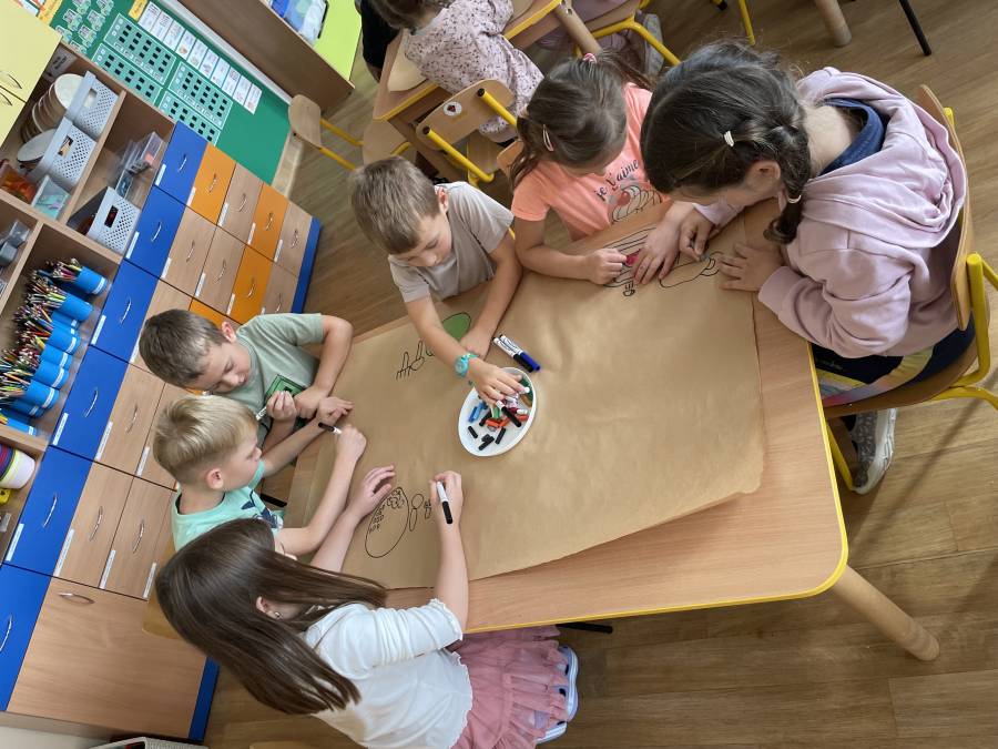Dzisiaj w grupie Misiów wykonywaliśmy pracę plastyczną w małych zespołach. Przedszkolaki na zajęciach poznały w jaki sposób każdy z nas w codziennych czynnościach może dbać o środowisko naturalne i troszczyć się o naszą planetę. Dzieci z zapałem przenosiły swoje pomysły na wspólną pracę, dwie grupy rysowały co szkodzi naszej planecie, a dwie co sprzyja życiu na Ziemi. Wszystkie pomysły były trafne i ciekawe.