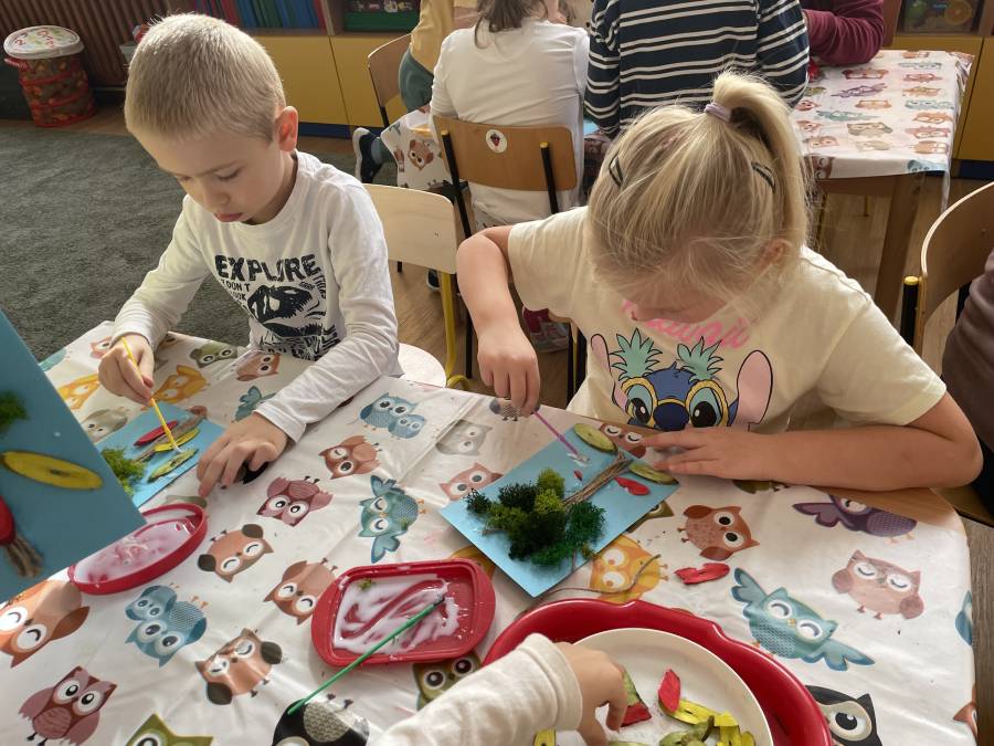 Dzisiaj w naszej grupie odbyły się warsztaty plastyczne prowadzone przez Panie z Klubu Seniora. Przedszkolaki z radością komponowały obrazki z wykorzystaniem darów jesieni. Nasi goście podzieliły się wiedzą i ciekawymi pomysłami na jesienne kompozycje z barwnych materiałów przyrodniczych. Gotowe prace można podziwiać na naszej grupowej galerii. Na koniec były gorące podziękowania za przygotowanie warsztatów i owocnie spędzony czas w radosnej atmosferze.