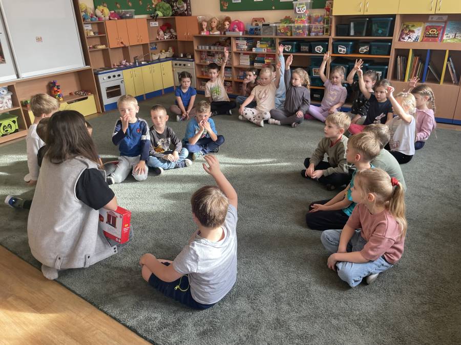 Dzisiaj na zajęciach przedszkolaki rozwijały umiejetność analitycznego myślenia, rozumowania i wnioskowania. Podczas zabaw w kodowanie dzieci układały kolorowe kubki na macie na podstawie podanych współrzędnych. Podczas quizu wykazały sie wiedzą na temat Polski, a właściwe odpowiedzi tworzyły wieżę. W grze zespołowej świetnie współpracowały ze sobą i z zaangażowaniem walczyły o punkty dla swojej drużyny. Kodowanie wzbudziło wiele pozytywnych emocji i stworzyło okazję do dokonywania wyborów.