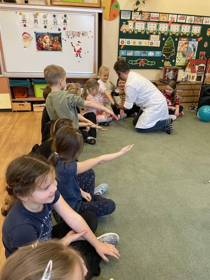 W dniu dzisiejszym naszą grupę odwiedził tata Alicji - Pan Michał, który pracuje jako chirurg. Przedszkolaki wspólnie układały puzzle będące narządami ciała człowieka. Wykazały się ogromną wiedzą na ten temat. Następnie każde dziecko losowało przedmiot o którym Pan Michał opowiadał do czego służą. Znalazły się tam między innymi wenflon, bandaż czy koc ratunkowy. Pluszowy piesek okazał się dzielnym pacjentem, dzięki któremu dzięki zobaczyły jak zakłada się kroplówkę oraz w jakich przypadkach się ją stosuje. Chętni mogli zmierzyć ciśnienie i, owijać się bandażem a także przybić prawdziwą pieczątkę lekarza na recepcie. Największą atrakcją był pokaz zszywania rany na bananie. Wymaga to wielkiej precyzji i skupienia. Każdy z przedszkolaków otrzymał naklejkę dzielnego pacjenta.