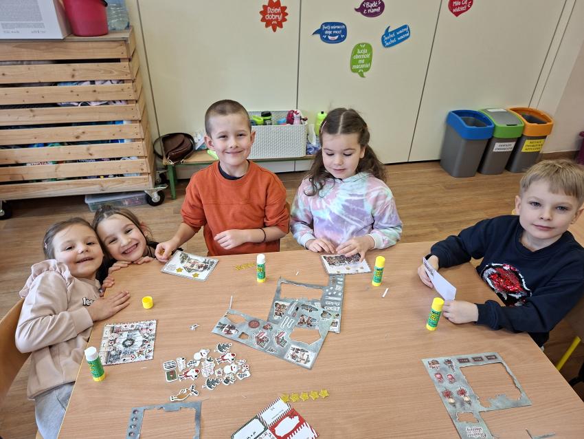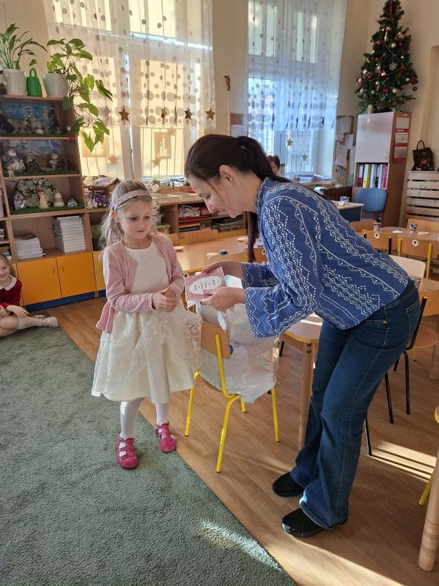 W dniu dzisiejszym gościliśmy rodzinę Poli: rodziców i dziadka. Wspólnie śpiewaliśmy najpiękniejsze polskie kolędy przy akompaniamencie instrumentów. Tata Poli grał na gitarze, dziadek na organach. Mama Poli przygotowała materiały do wykonania kartek świątecznych, które mogliśmy oglądać w galerii grupowej. Na pamiatkę świątecznego spotkania z rodziną Poli dzieci otrzymały małe upominki z akcentem świątecznym.