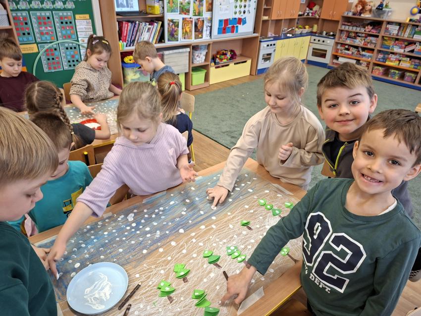 W dniu dzisiejszym na zajęciach plastycznych przedszkolaki wykonały pracę LAS ZIMĄ metodą Doroty Dziamskiej EDUKACJA PRZEZ RUCH, która wykorzystuje naturalny ruch dziecka do stymulacji zmysłów. Najpierw dzieci rytmicznie kreśliły kreski do utworu Annen Polka J. Straussa. Potem przyklejały drzewa wykorzystując technikę origami, a na koniec białą farbą odbijały palcem śnieg. Prace wykonały w małych grupach rozwijając umiejetność współpracy i szacunku dla siebie. Brawo dla dzieci, piękny efekt, owocna współpraca.